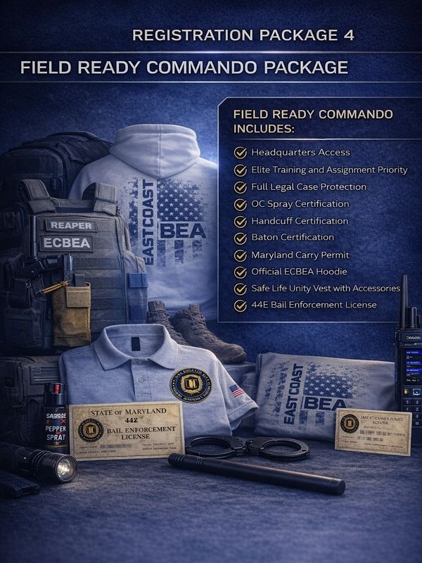 Package #4 is the highest tier offered and is designed for candidates seeking full equipment issuance, professional licensing support, premium uniforming, and a direct pathway into active bail enforcement operations without needing to source gear, training, or guidance independently.